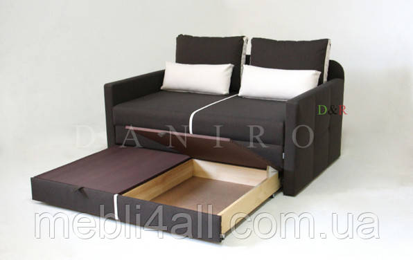 Каркас виготовлений з натурального дерева. М'які підлокітники. З декоративними подушками. Є простора ніша для постільної білизни