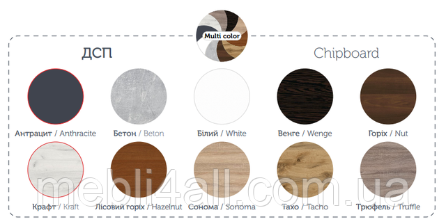 | Колір (відтінок) меблів | Дуб Тахо, Антрацит, Горіх лісовий, Крафт білий , Горіх, Бетон, Венге, Дуб трюфель, Дуб сонома, Білий |